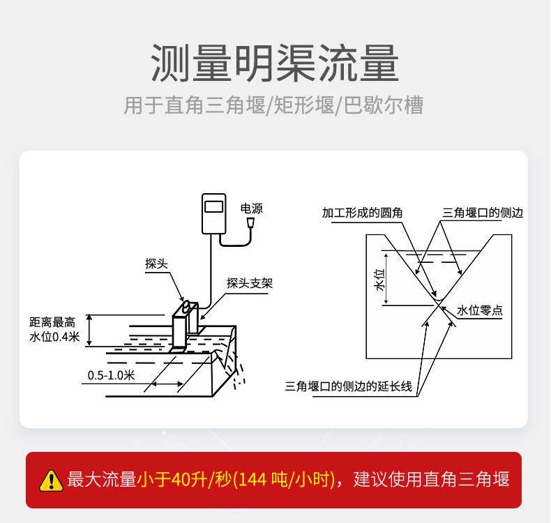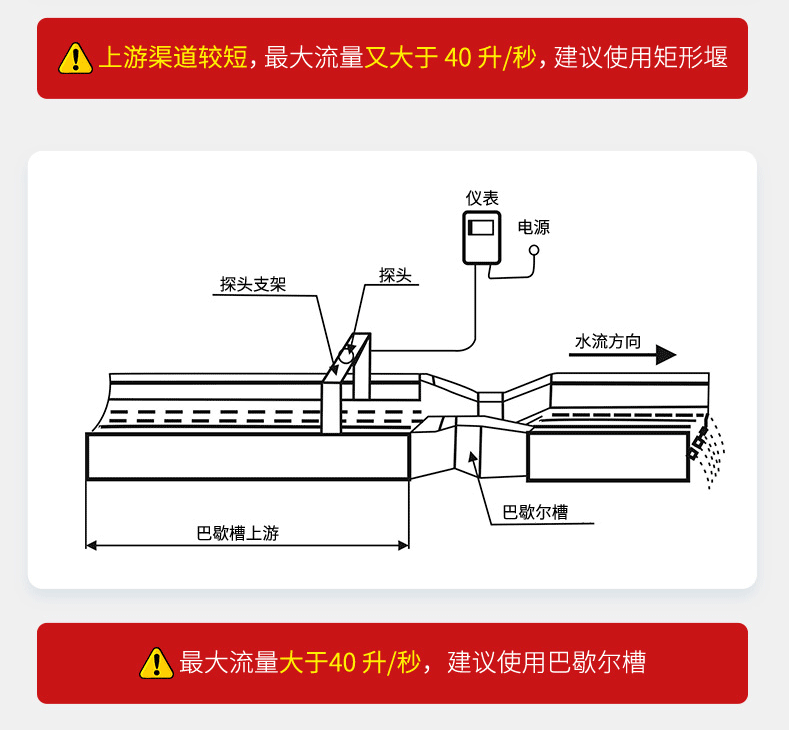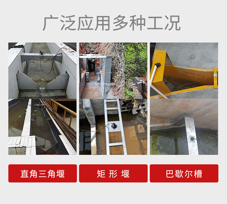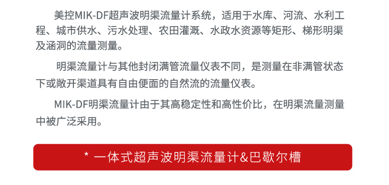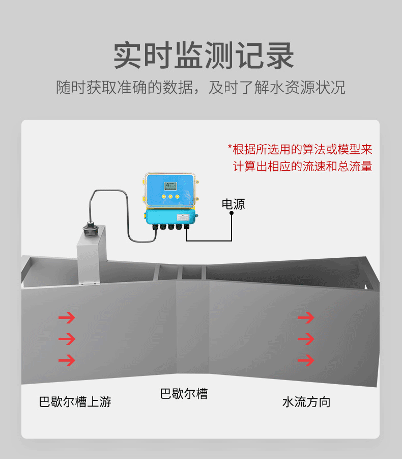 明渠流量计以流速-水位运算法为基础,并采用了先进的流速测量仪和水位测量仪,从而确保测速和运算的准确性的一种新型智能化流量系统,根据渠道的宽度和测量精度的要求,采用单探头法或多探头法明渠测流的数学模型。明渠流量计是非接触测量,能在较恶劣的环境中应用。明渠流量计应用场所有城市供水引水渠、火电厂冷却引水河排水渠、污水治理流入和排放渠、工况企业废水排放以及水利工程和农业灌溉用渠道等。(我们不提供配套的巴歇尔槽)
